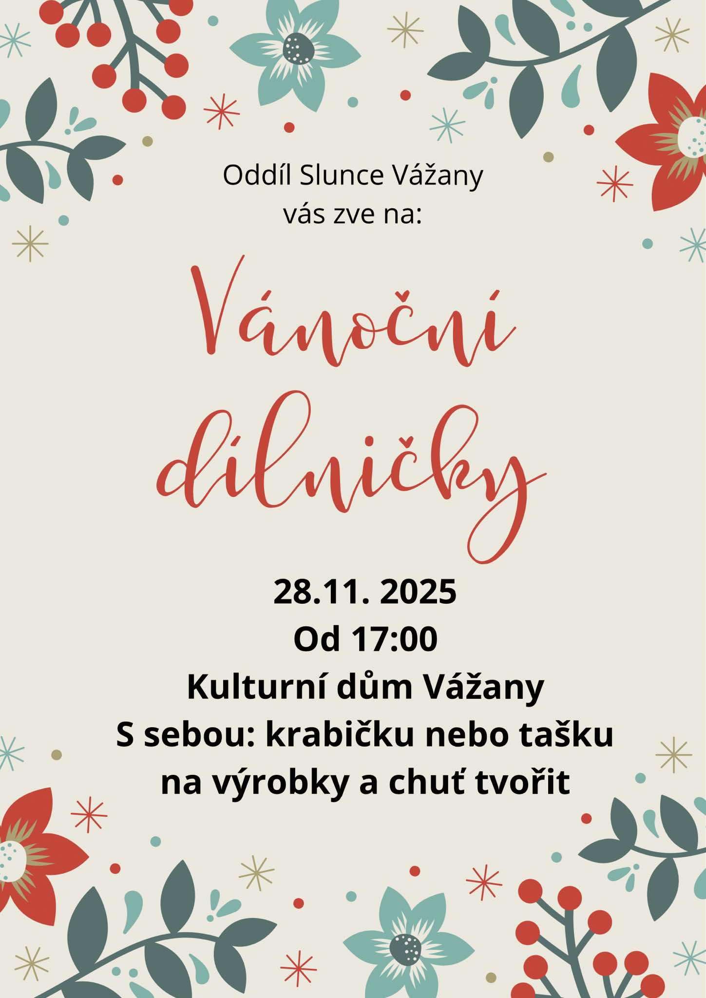 Oddíl Slunce Vážany Vás zve na Vánoční dílničky, které se budou konat v pátek 28.11.2025 od 17. hodin v sále kulturního domu ve Vážanech.