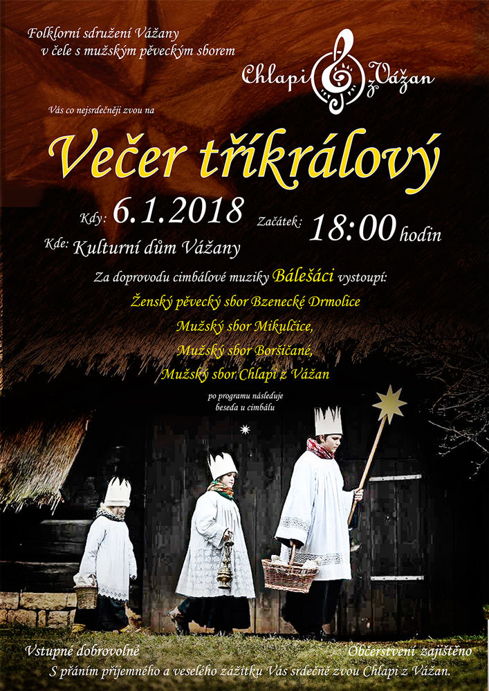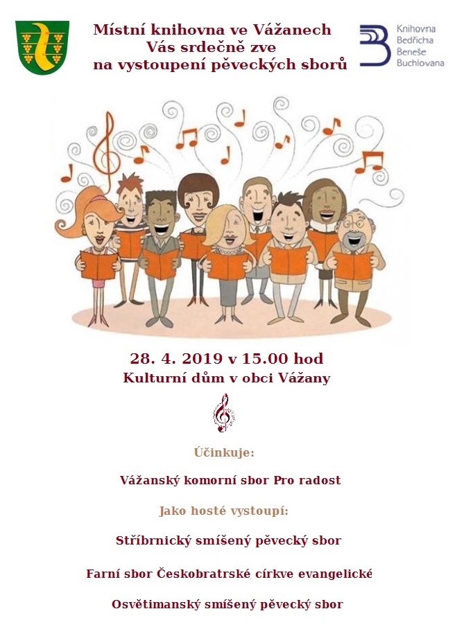 Vystoupí mužské sbory: JMF z Derfle, MPS z Lipova, Chlapi z Vážan. Občerstvení zajištěno, vstupné dobrovolné.