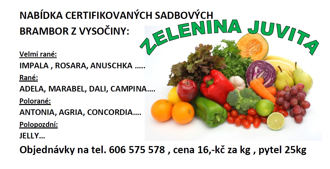 Soukromý prodejce p. Synek z Vacenovic bude ve středu 23.9. 2020 od 9.30 do 10.00 hod. prodávat před obecním úřadem jablka golden a gala za 26 Kč/kg, brambory na uskladnění Marabel, balení 25 kg balení za 10 Kč/kg, cibulí za 12,- Kč/kg, česnek za 150,- Kč/kg a včelí med za 170,- Kč.