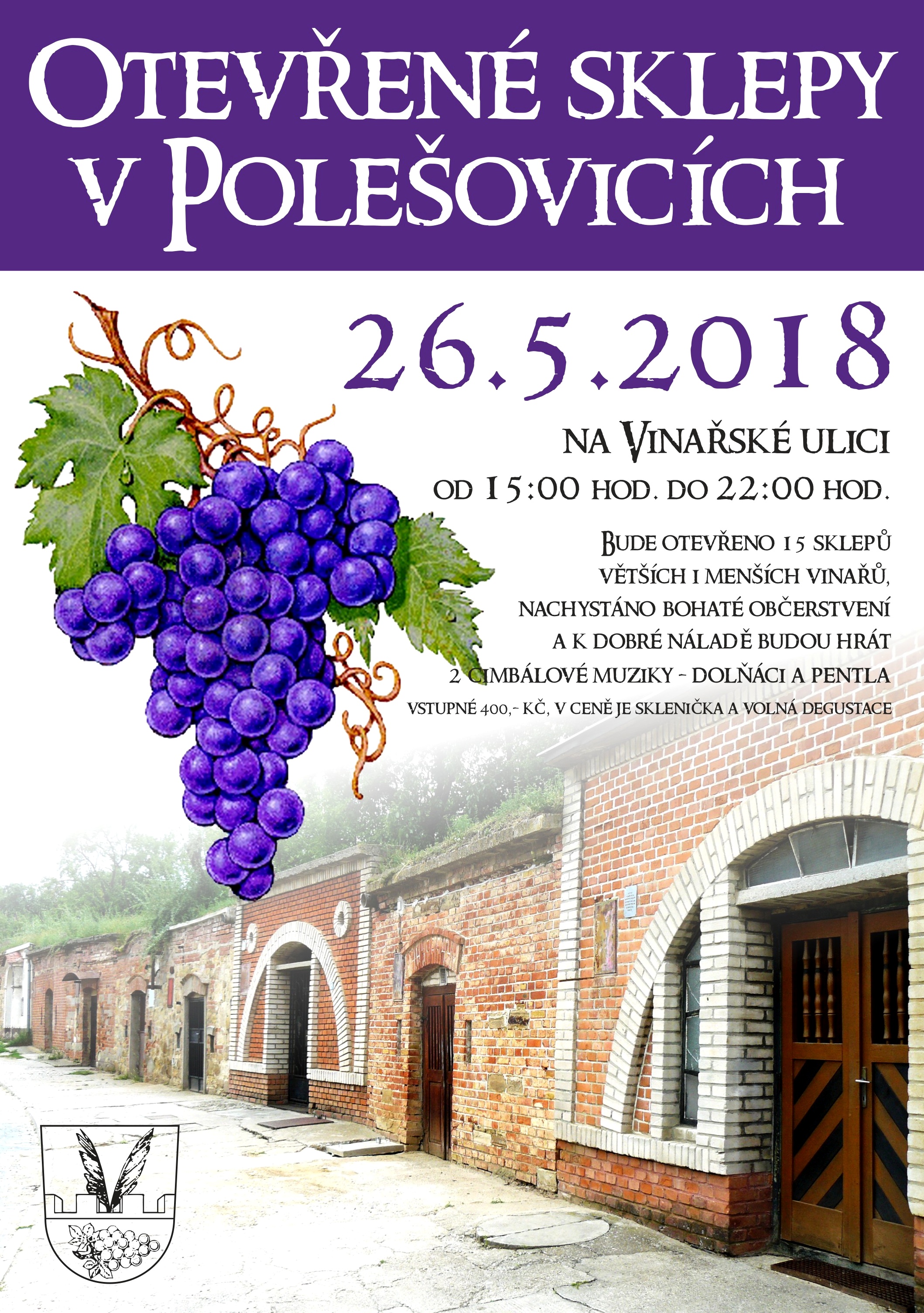Otevřené sklepy v Polešovicích Sobota 26. 5. 2018 Vinařská ulice - 15 sklepů 15.00-22.00 Bližší informace v příloze